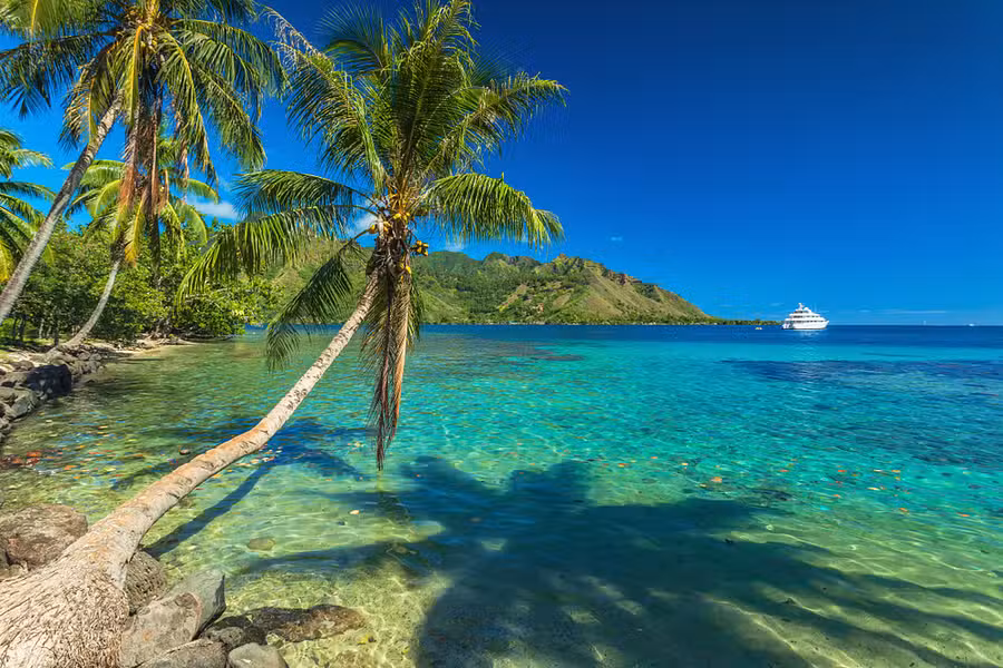 One of the most picturesque and geographically diverse islands in the Society Group, Enclosed in a single lagoon, it covers 75 square miles. Huahine is located 109 miles northwest of Papeete. The highest point on the island, Mt. Turi, reaches 2,200 feet and is located on Huahine Nui. Mt. Tavaiura in the Fitii Peninsula looks like a women's face, leading to her chest and her round belly, hence one of the interpretation for Huahine's original name (pregnant woman).