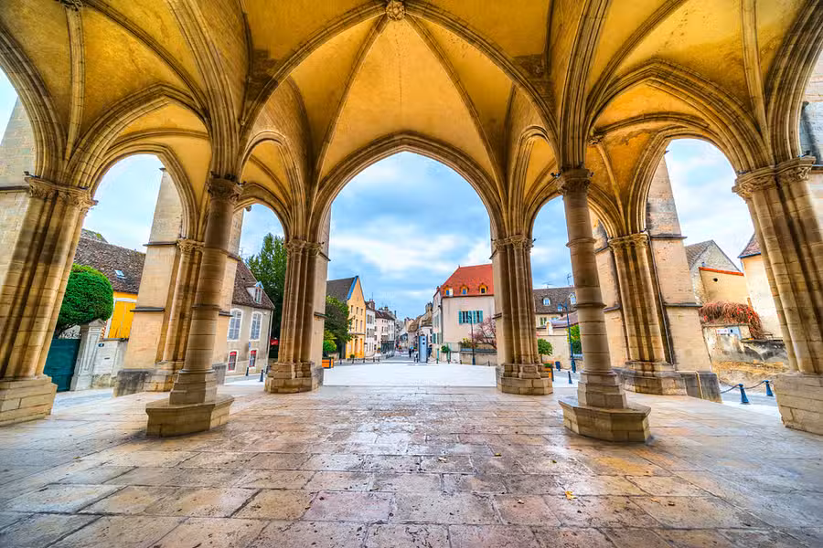 Beaune is a walled town at the center of the Burgundy winemaking region in France. Surrounded by the Côte d'Or vineyards, the cobbled town is renowned for an annual wine auction held at the Hôtel-Dieu (Hospices de Beaune). Recognized by its colorful, geometric-patterned tile roof, this 15th-century former hospital is now the Hôtel-Dieu Museum, showcasing works like "The Last Judgement" altarpiece by Van der Weyden.