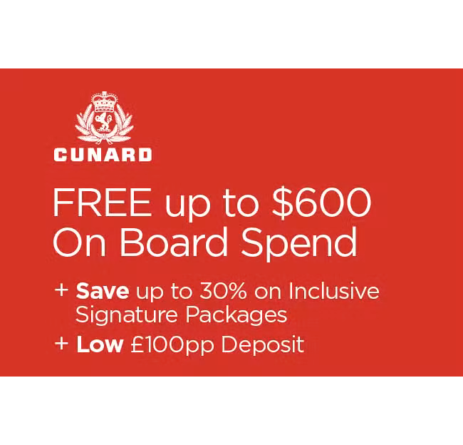 Let Cunard treat you to FREE up to $600 On Board Spend per couple^ to indulge in a host of extraordinary experiences. Plus, make the most of the new Cunard Signature Packages. Inclusive collections crafted for effortless holidays where you can Save up to 30%^^ and enjoy drinks, WiFi, and dining.