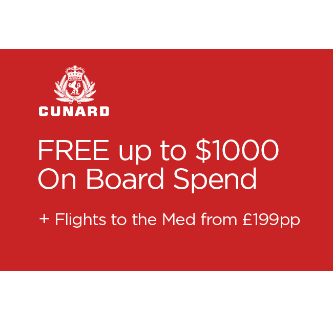 Plus Fly out to meet Cunard’s Queen Victoria or Queen Elizabeth in the Mediterranean with flights from just £199pp^^ on selected 2026 and 2027 voyages. Anticipate the freedom of space, tempting dining choices, and new possibilities to uncover each day.