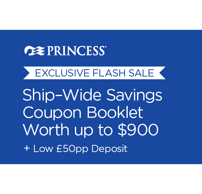 Looking for a reason to book your dream Princess' Cruises holiday? With our Exclusive Flash Sale you can receive a Ship Wide Savings Coupon Booklet worth over $900 Plus you can secure your itinerary with a low £50pp Deposit^