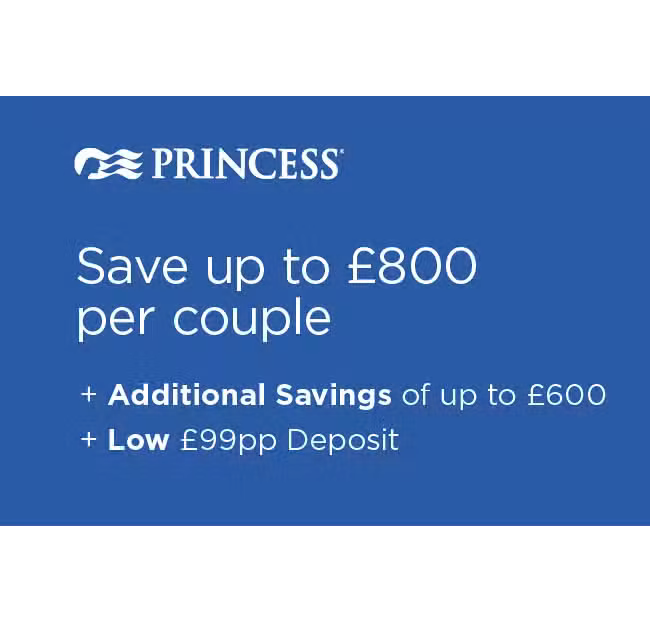 Now is the perfect moment to book your next Princess cruise, with Savings of up to £800 off per couple^, and the added bonus of extra savings of up to £600 across selected 2026 Fly-Med Sailings^^. Plus, you can secure your booking with a Low £99 Deposit^^^, giving you even more reasons to set sail for somewhere extraordinary.