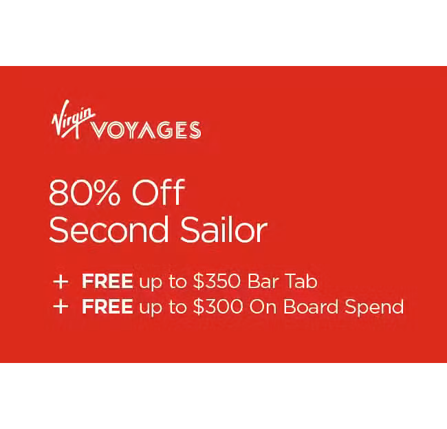It's summer year round with Virgin Voyages famed Lady ships - from multiple "Best Food at Sea" awards to their sunshine drenched, kid free experiences - there is another reason to sail with Savings of up to 80% Off Second Guest^ plus a FREE Bar Tab of up to $350^^ and FREE up to $300 On Board Spend on select sailings^^^.