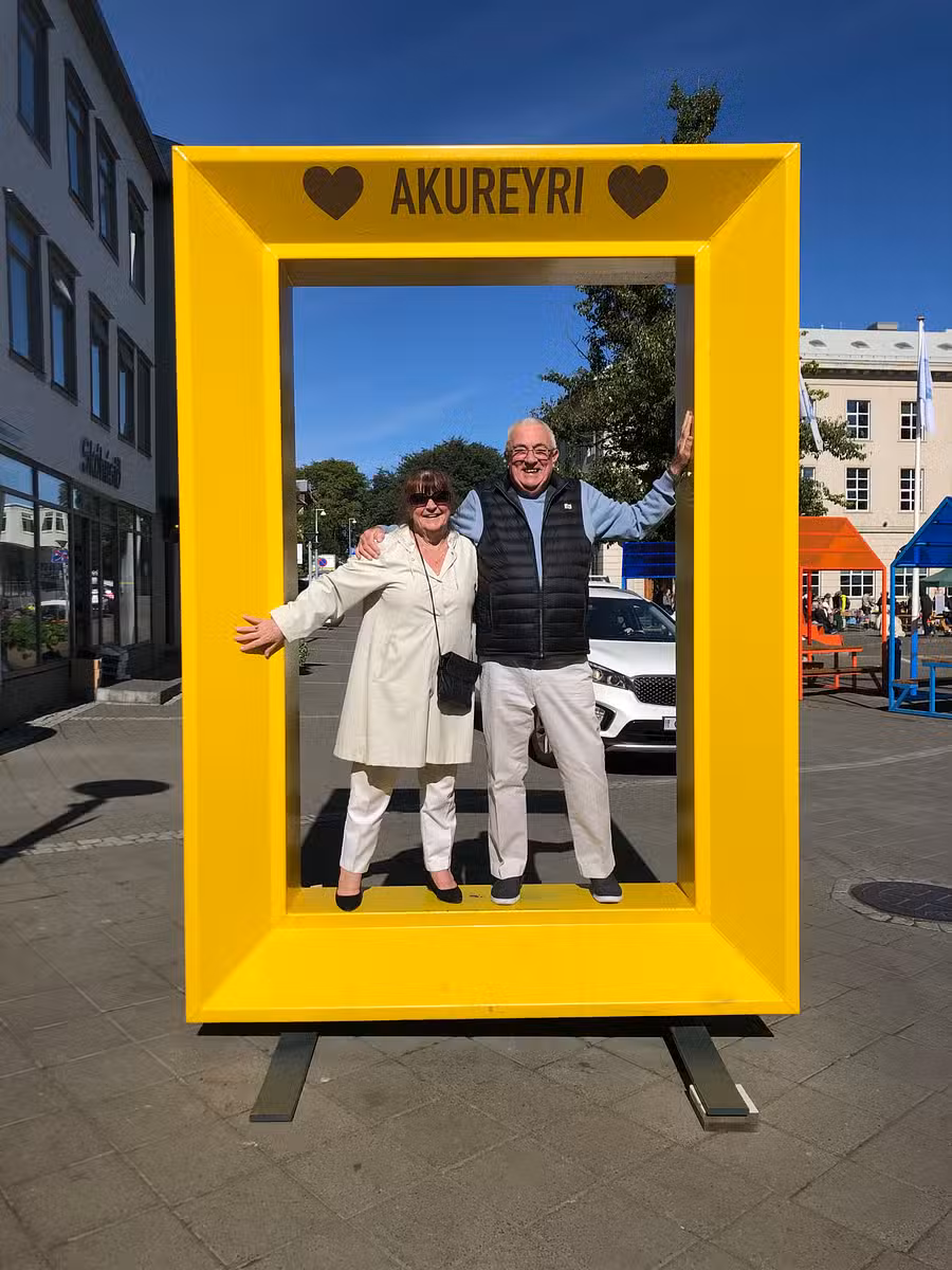 Having fun in Akureyri Fjord on our Icelandic cruise. Even in our 70s, we can still have a blast! Iceland is one of the friendliest places to visit. The food is interesting and enjoyable, and the fjords are breathtaking. I would highly recommend.